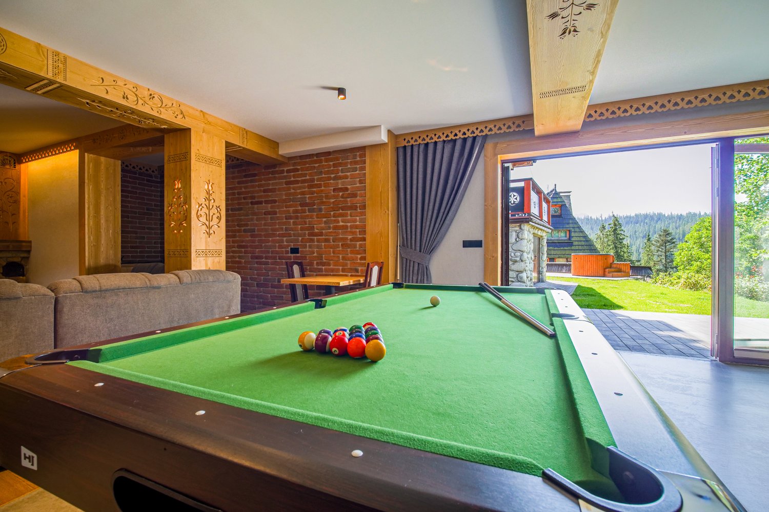 Po relaksie w bani zapraszamy Cie do klimatycznej sali z prawdziwym kominkiem zbudowanym na skale, bilardem, 200-u calowym ekranem, na którym można obejrzeć filmy, mecze oraz bajki z dziećmi.