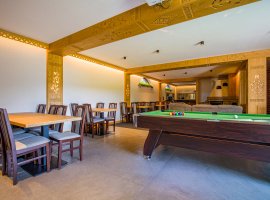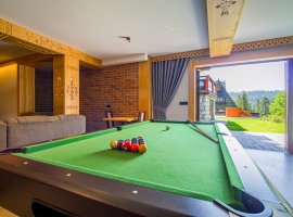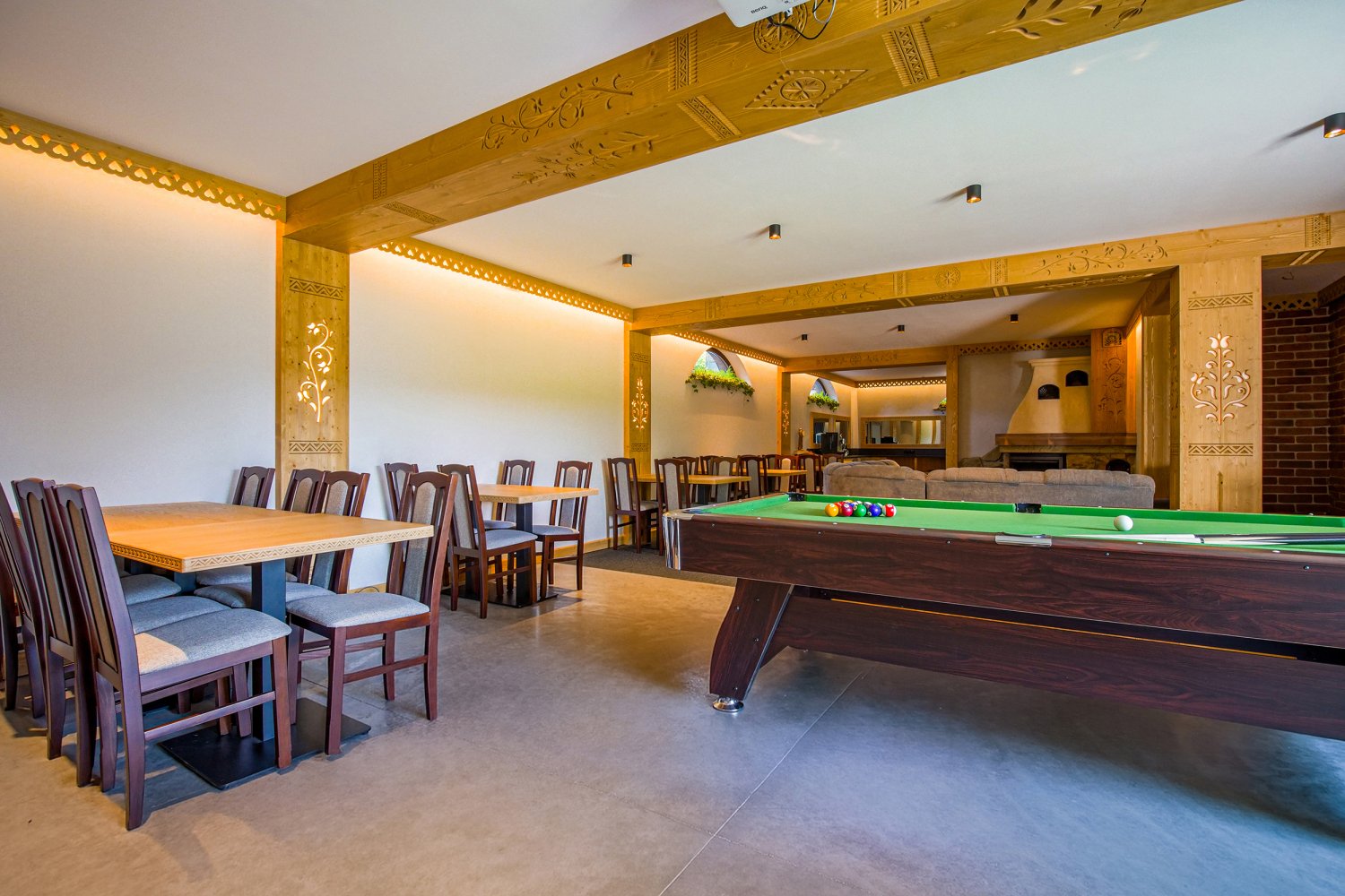 Po relaksie w bani zapraszamy Cie do klimatycznej sali z prawdziwym kominkiem zbudowanym na skale, bilardem, 200-u calowym ekranem, na którym można obejrzeć filmy, mecze oraz bajki z dziećmi.
